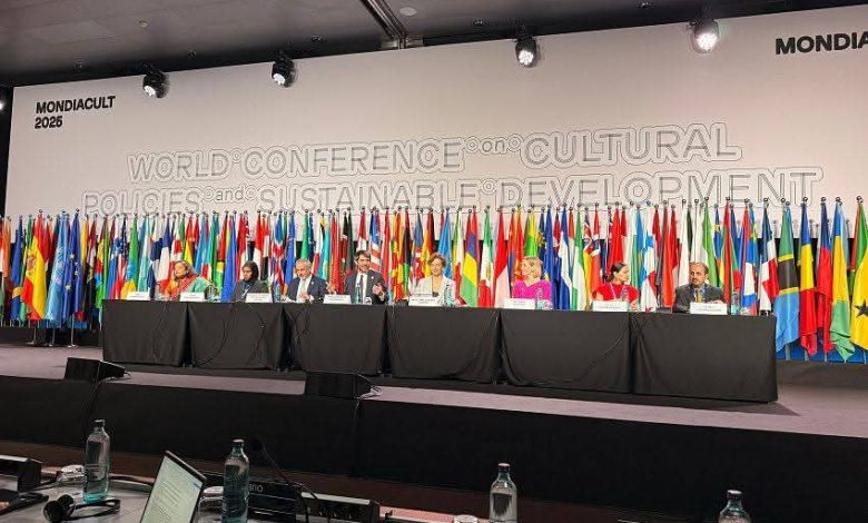 جاء ذلك خلال مشاركة وزير الإعلام والثقافة والسياحة، ممثلًا للجمهورية اليمنية، في أعمال المؤتمر العالمي لليونسكو للسياسات الثقافية والتنمية المستدامة “موندياكولت 2025″، الذي عُقد خلال الفترة من 29 سبتمبر إلى 1 أكتوبر بمدينة برشلونة الإسبانية، بمشاركة وزراء الثقافة وممثلي المنظمات الدولية والإقليمية والخبراء والفاعلين الثقافيين من مختلف دول العالم.