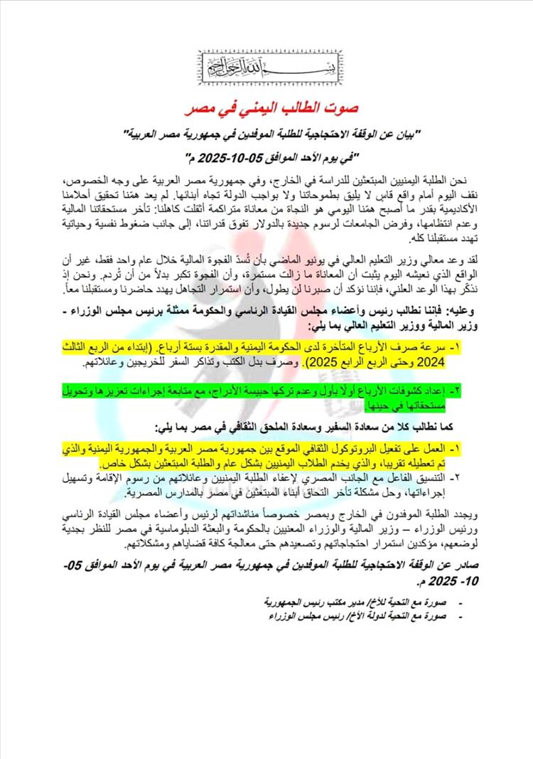 كما ناشد الطلاب البعثة الدبلوماسية اليمنية في القاهرة، وعلى رأسها السفير والملحق الثقافي، بالعمل على تفعيل البروتوكول الثقافي الموقع بين مصر واليمن، والسعي لإعفاء الطلاب اليمنيين من رسوم الإقامة، وتسهيل التحاق أبنائهم بالمدارس المصرية، باعتبار ذلك حقًا إنسانيًا وأكاديميًا لا يقبل التهاون.