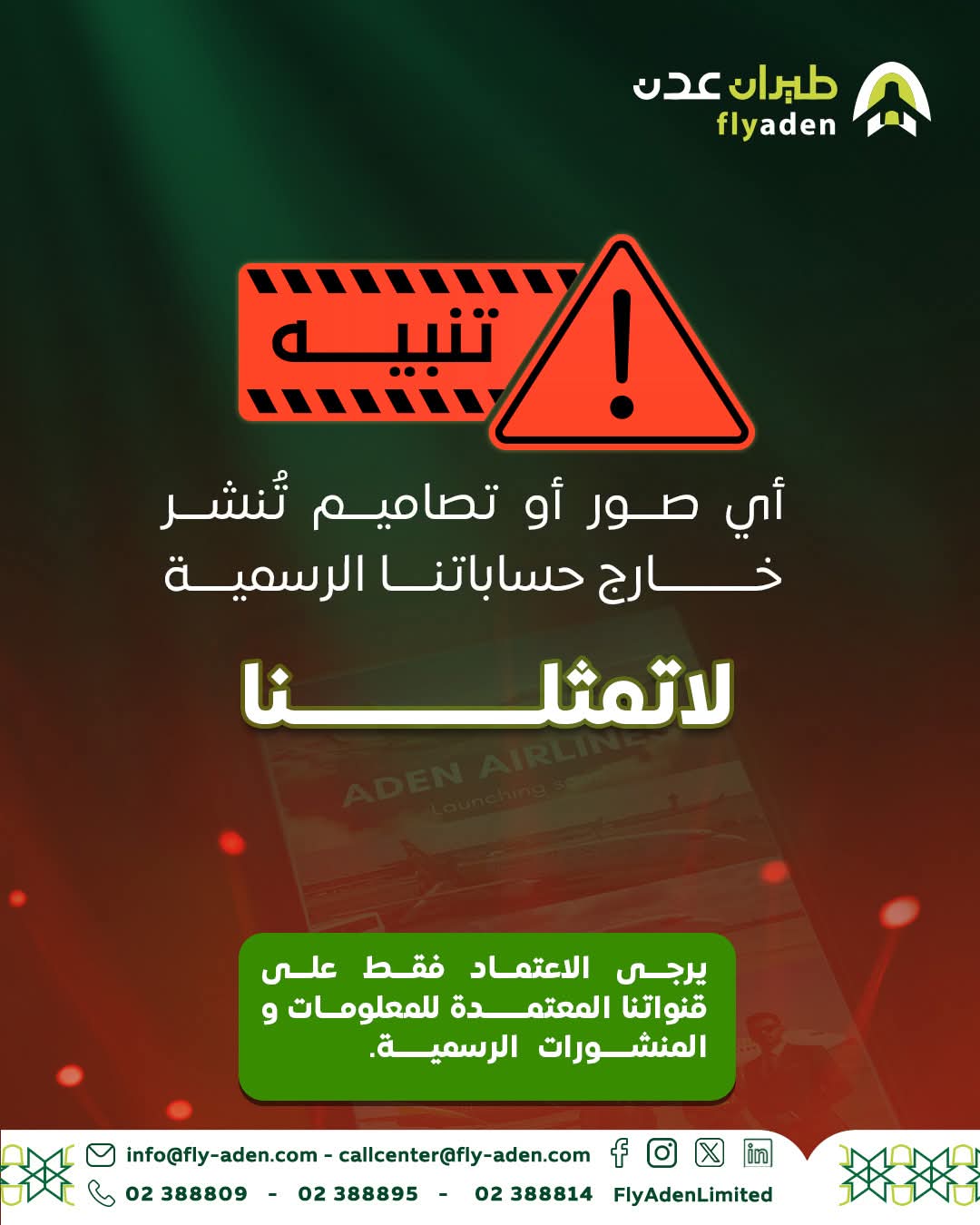تود شركة طيران عدن أن توضح لعملائها ومتابعيها الكرام أن أي تصاميم أو صور تخص طائرات الشركة يتم تداولها خارج القنوات الرسمية لا تُمثل الشركة بأي شكل من الأشكال.