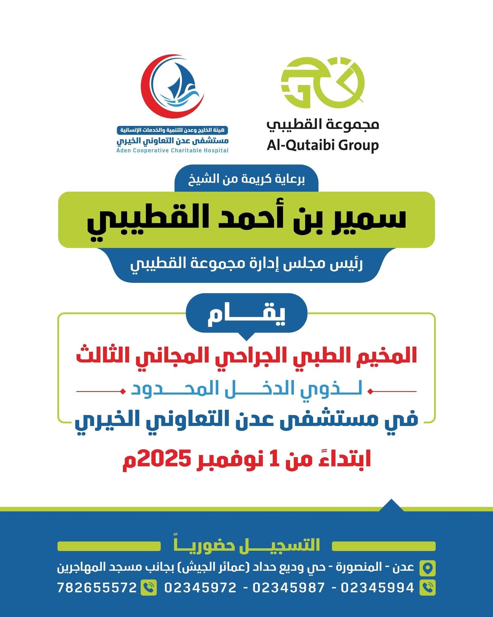 ينطلق في الأول من نوفمبر 2025م المخيم الطبي الجراحي المجاني الثالث في مستشفى عدن التعاوني الخيري، برعاية كريمة من رجل الأعمال الشيخ سمير القطيبي، رئيس مجلس إدارة مجموعة القطيبي، وذلك استمراراً للجهود الإنسانية الرامية إلى تخفيف معاناة المرضى من ذوي الدخل المحدود.