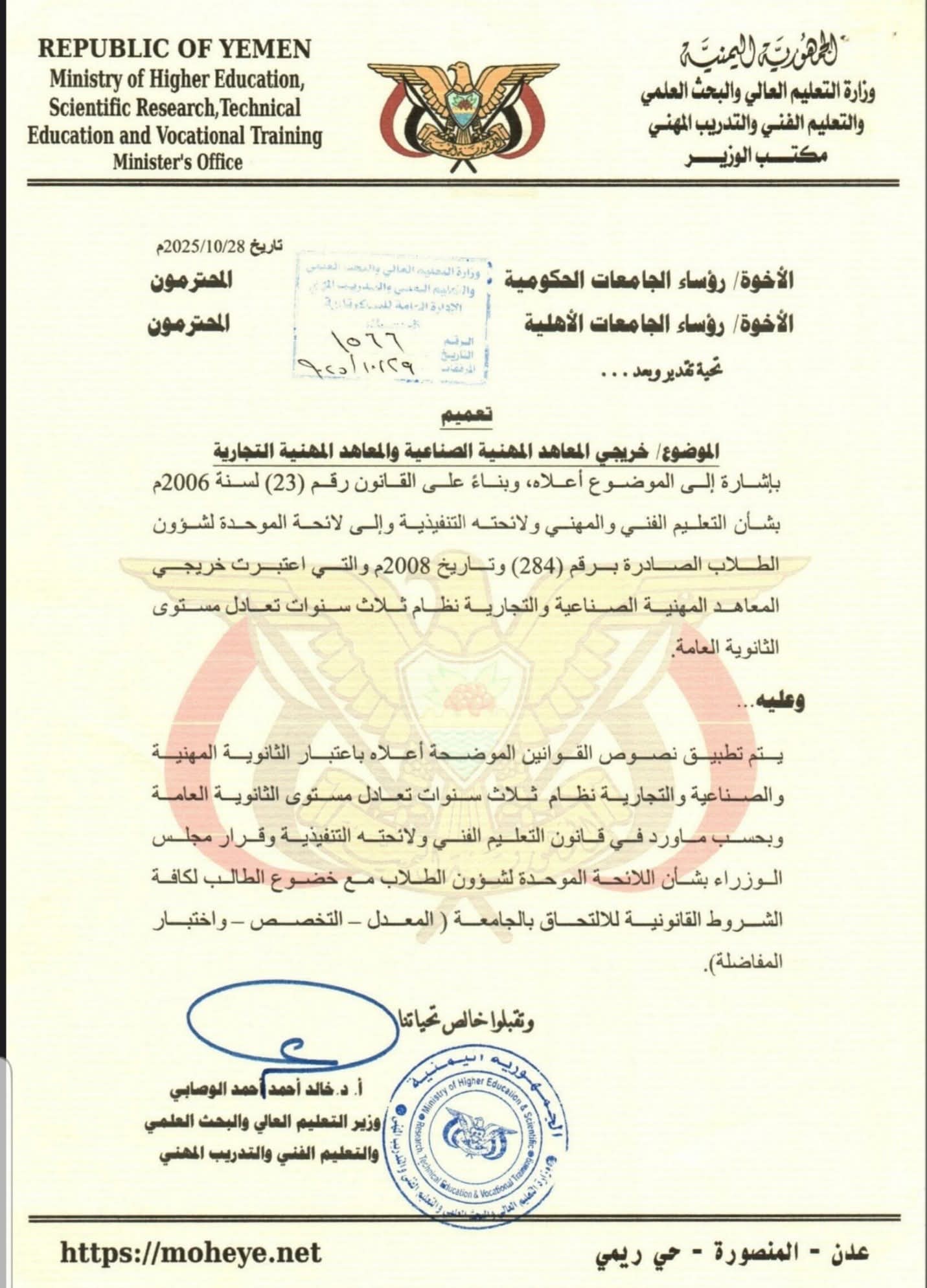 *اصدر معالي وزير التعليم العالي والبحث العلمي والتعليم الفني والتدريب المهني الدكتور /خالد احمدالوصابي. تعميمآ ذات مرجع 1566 تاريخ 2025/10/29م*