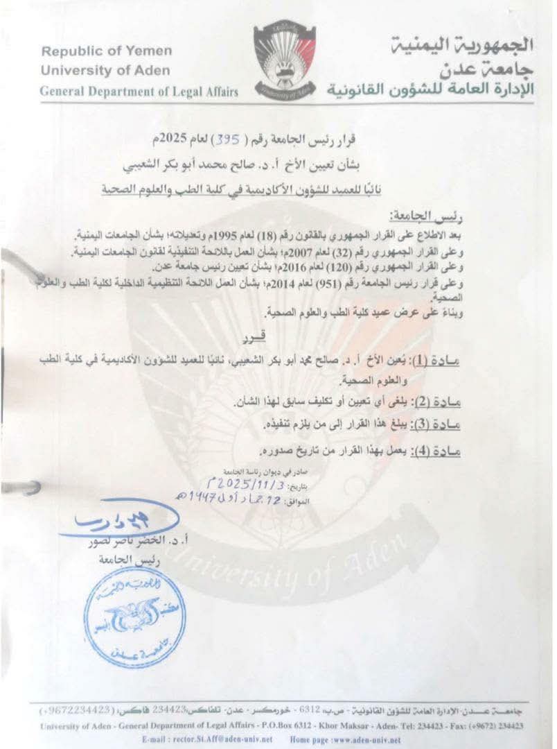 أصدر رئيس جامعة عدن الدكتور/خضر لصور القرار رقم ( ) بتعيين البروفيسور صالح الشعيبي نائباً لعميد كلية الطب للشؤون الاكاديمية- بجامعة عدن..