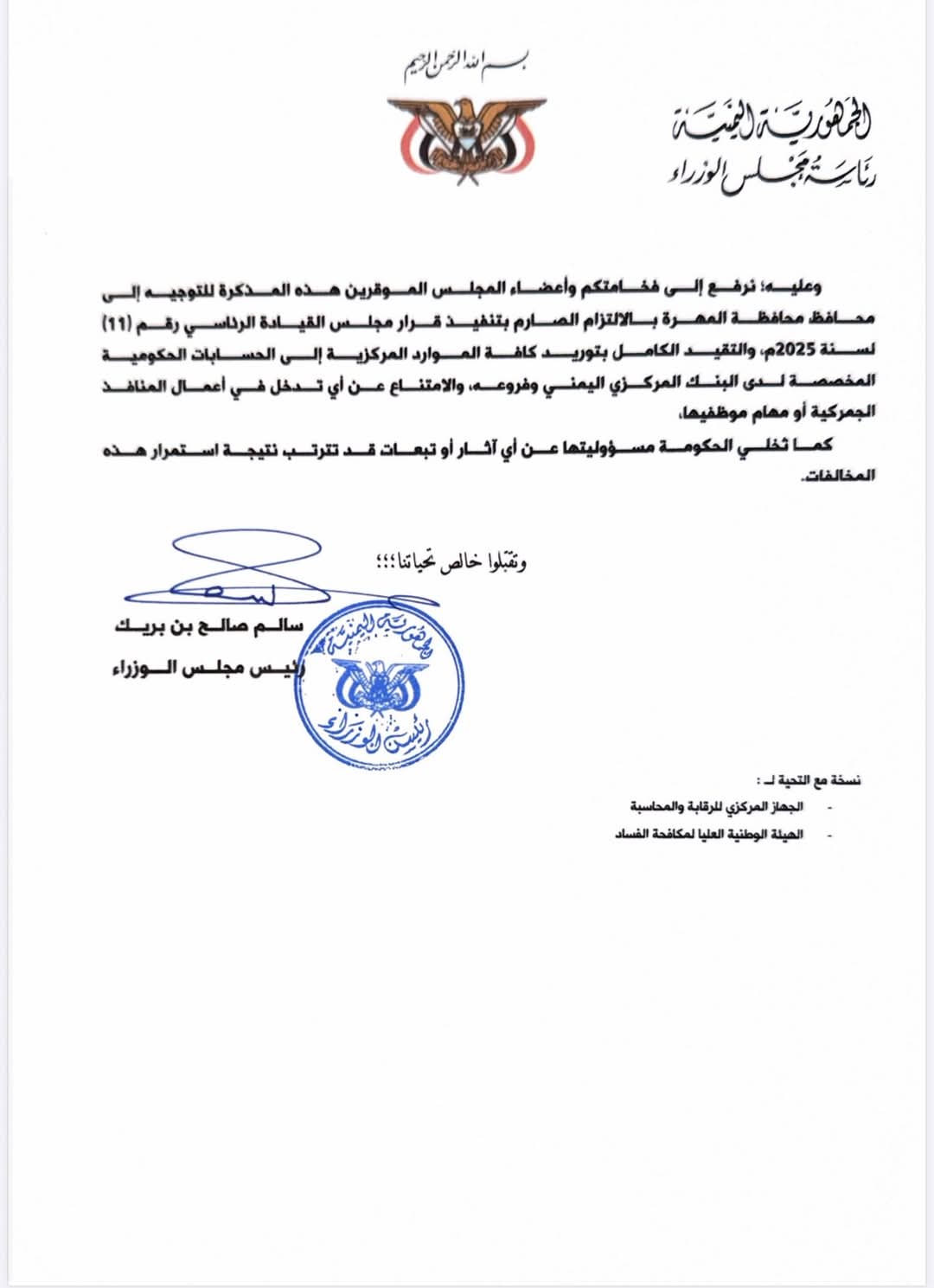 رفع رئيس الوزراء سالم بن بريك شكوى بمحافظ المهرةوالوكلاء الى مجلس القيادة الرئاسي بعد امتناعهم عن التوريد الى البنك المركزي وجاء في رسالة رئيس الحكومة: