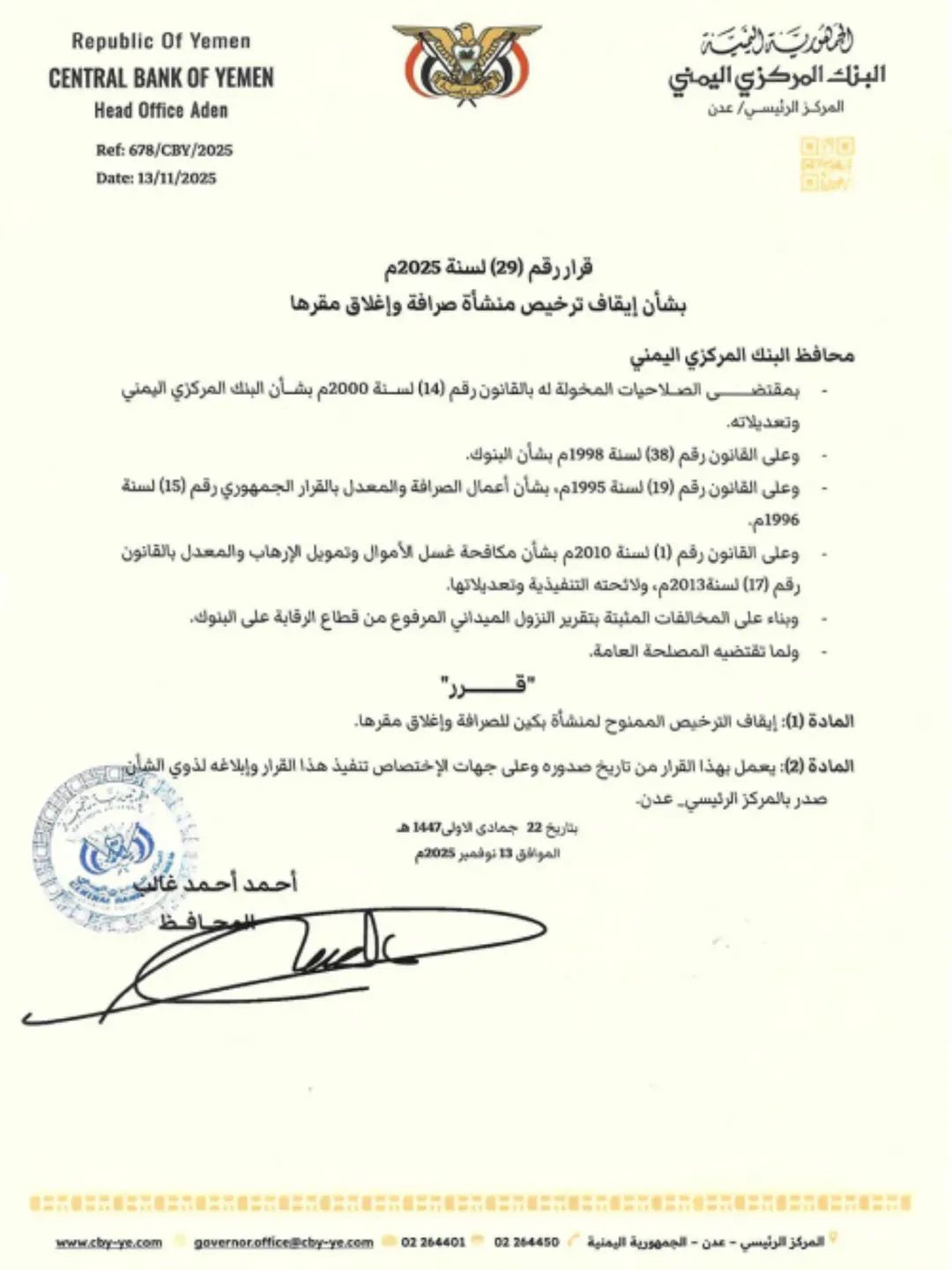 محافظ البنك يصدر قرار رقم 29 بشأن إيقاف ترخيص منشأة صرافة وإغلاق مقرها