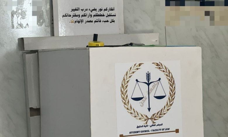عدن اوبزيرفر/خاص:في ظل جهود عمادة كلية الحقوق والمجلس الطلابي لتعزيز قنوات التواصل المباشر مع طلاب الكلية، وبرعاية عميد الكلية أ.مشارك د. محمد صالح محسن، وبإشراف المجلس الطلابي، قامت دائرة شؤون الطلاب والطالبات يوم الخميس الموافق 11 ديسمبر 2025م بتنفيذ مبادرة إطلاق صندوق الملاحظات والاقتراحات داخل مبنى الكلية.