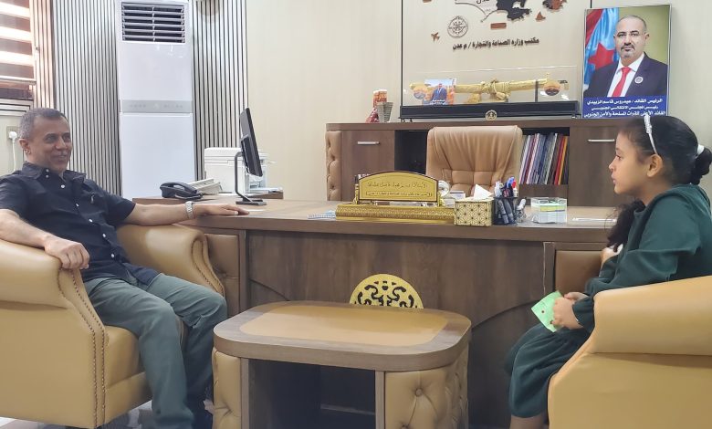 في لفتة أبوية حانية، استقبل العميد وسيم محمد العُمري، مدير عام مكتب الصناعة والتجارة بالعاصمة عدن، الطفلة منيرة رامي بن شجاع، وجاء هذا اللقاء تقديراً لظهورها الإعلامي المميز، الذي عبرت فيه بصدق وبراءة عن آمال جيل المستقبل وتطلعاتهم الكبيرة، مما نال استحسان الجميع.