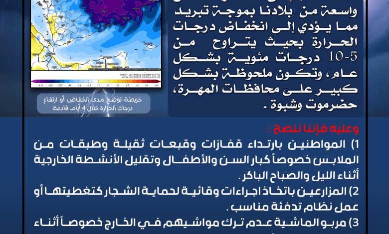 أفاد مركز التنبؤات الجوية والإنذار المبكر التابع للهيئة العامة للطيران المدني والأرصاد، في نشرة جوية صادرة مساء اليوم 19/12/2025، ولمدة أربعة أيام، بأن مخرجات النماذج العددية وتحليل خرائط الطقس المختلفة، تشير إلى تأثر مناطق واسعة من بلادنا بموجة تبريد مما يؤدي إلى انخفاض درجات الحرارة، بحيث يتراوح من 5 – 10 درجات مئوية بشكل عام، مشيراً إلى أن الانخفاض يكون ملحوظاً بشكل كبير على محافظات المهرة وحضرموت وشبوة.