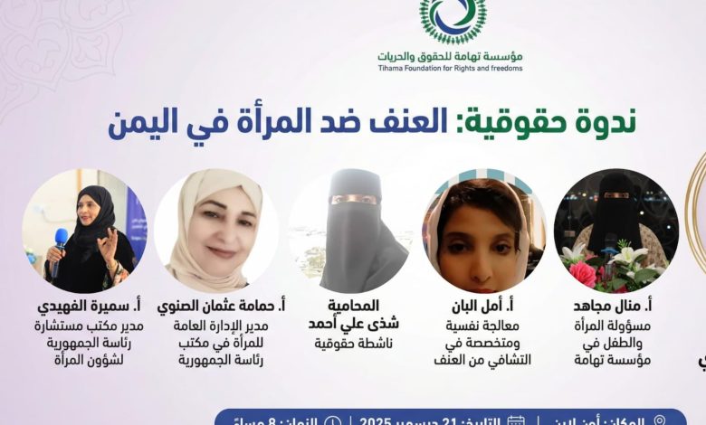 نظّمت مؤسسة تهامة للحقوق والحريات مساء الأحد 21 ديسمبر 2025 ندوة موسعة عبر منصة زووم لمناقشة تصاعد العنف ضد المرأة في اليمن، بمشاركة مختصات في قضايا المرأة والعنف والدعم النفسي، وسط تأكيدات بأن الحرب المستمرة جعلت النساء الحلقة الأضعف في مواجهة الانتهاكات.