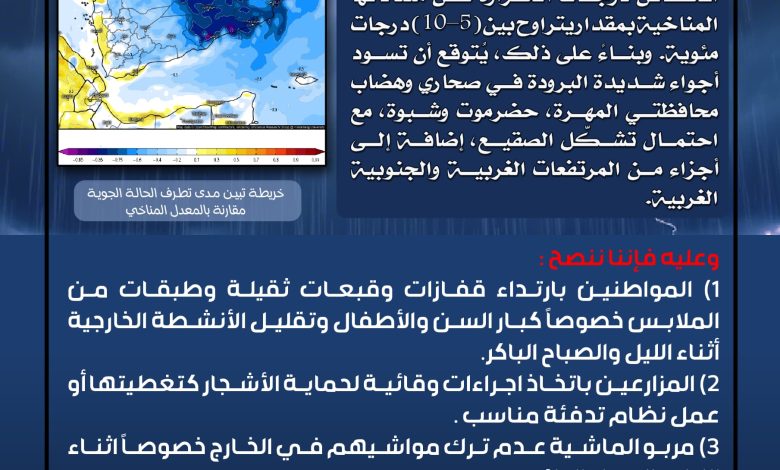 أكد مركز التنبؤات الجوية والإنذار المبكر التابع للهيئة العامة للطيران المدني والأرصاد، في نشرة جوية صادرة مساء اليوم 22/12/2025، ولمدة أربعة أيام، أن مخرجات النماذج العددية وتحليل خرائط الطقس المختلفة، تشير إلى استمرار تأثر بلادنا بموجة بَرْد، يُتوقع على إثرها انخفاض درجات الحرارة عن معدلاتها المناخية بمقدار يتراوح بين (5–10) درجات مئوية، وأنه بناءً على ذلك، يُتوقع، بمشيئة الله، أن تسود أجواء شديدة البرودة في صحاري وهضاب محافظتي المهرة، حضرموت وشبوة، مع احتمال تشكّل الصقيع، إضافة إلى أجزاء من المرتفعات الغربية والجنوبية الغربية.