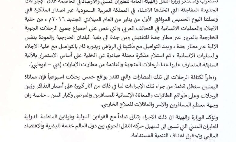 تستغرب وتستنكر وزارة النقل والهيئة العامة للطيران المدني والأرصاد في العاصمة عدن، الإجراءات الجديدة المفاجئة التي اتخذها الأشقاء في المملكة العربية السعوية عبر إصدار المذكرة التي وصلتنا اليوم الخميس الموافق الأول من يناير من العام الميلادي الجديد ٢٠٢٦م، من خلية الإجلاء والعمليات الإنسانية في التحالف العربي، والتي تنص على إخضاع جميع الرحلات الجوية الخارجية بالمرور عبر مطار جدة للتفتيش، ومن جدة إلى بقية البلدان الخارجية والعودة بنفس الآلية عبر مطار جدة.. وبعد التواصل مع مكتبنا في الرياض، وبدوره قام بالتواصل مع خلية الإجلاء والعمليات الإنسانية، تم استلام مذكرة معدلة صادرة عن الخلية على أساس الاستمرار بالآلية السابقة المتعارف عليها عدا الرحلات المتجهة والقادمة من مطارات الإمارات (دبي – أبوظبي).