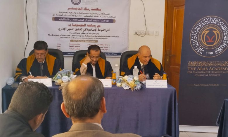 نال الباحث عارف العجي الطالبي درجة الماجستير من الأكاديمية العربية للعلوم الإدارية والمالية والمصرفية، عن رسالته العلمية الموسومة بـِ “أثر القيادة الإبداعية في تحقيق التميز الإداري – دراسة ميدانية على موظفي جامعة إقليم سبأ”.