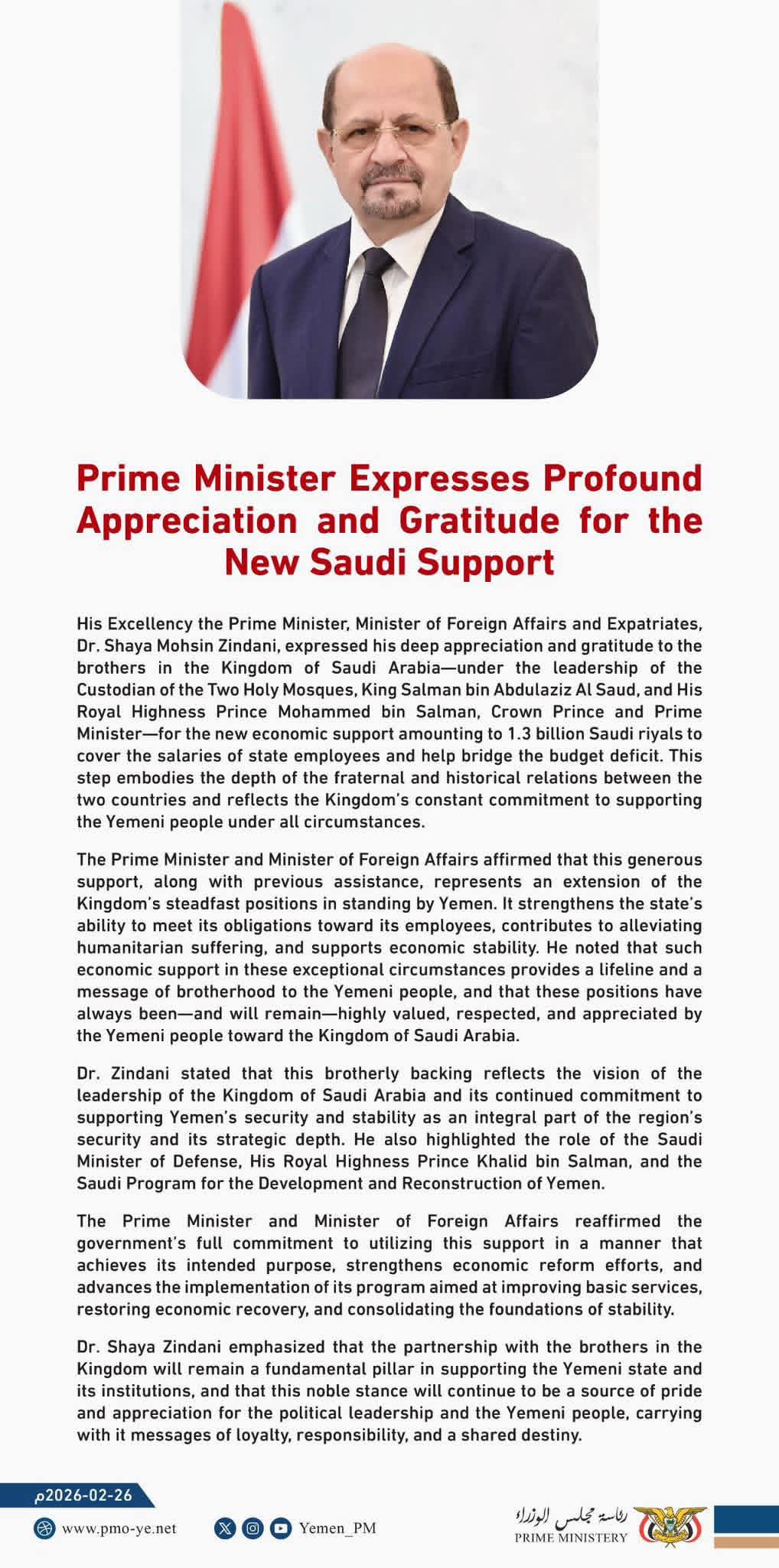 أكد رئيس الوزراء ووزير الخارجية أن هذا الدعم السخي إلى جانب مساعدات سابقة يمثل امتداداً لموقف المملكة الثابتة في الوقوف إلى جانب اليمن. يعزز قدرة الدولة على الوفاء بالتزاماتها تجاه موظفيها، ويساهم في تخفيف المعاناة الإنسانية، ويدعم الاستقرار الاقتصادي. ولاحظ أن مثل هذا الدعم الاقتصادي في هذه الظروف الاستثنائية يوفر حبل نجاة ورسالة أخوة للشعب اليمني، وأن هذه المواقف كانت دائما – وستظل – عالية التقدير والاحترام والتقدير من قبل الشعب اليمني تجاه المملكة العربية السعودية.