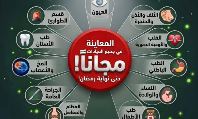 وأوضح المستشفى أن العروض الجديدة تشمل المعاينة المجانية في جميع العيادات حتى نهاية شهر رمضان، إلى جانب خصم بنسبة 30% على جميع خدمات العيادات الطبية، وذلك ضمن مختلف التخصصات، منها العيون، الأنف والأذن والحنجرة، القلب والأوعية الدموية، الطب الباطني، النساء والولادة، طب الأطفال، العظام والمفاصل، الجراحة العامة، المخ والأعصاب، وطب الأسنان، إضافة إلى خدمات قسم الطوارئ.