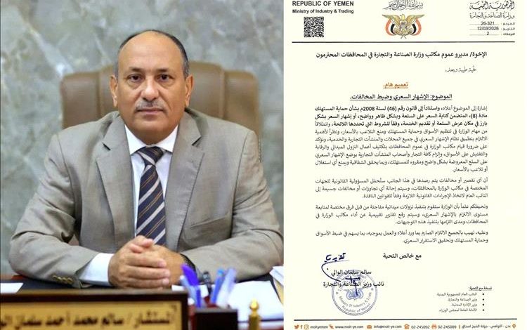 وشدد التعميم على ضرورة قيام مكاتب الوزارة في المحافظات بتكثيف النزول الميداني وأعمال التفتيش والرقابة على الأسواق، وإلزام جميع التجار والمنشآت التجارية بوضع الإشهار السعري بشكل واضح ومقروء على السلع المعروضة، بما يعزز الشفافية ويحمي المستهلك من أي استغلال أو تلاعب بالأسعار.