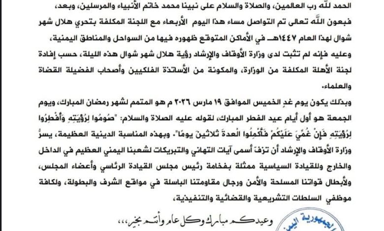 وبذلك يكون يوم غدٍ الخميس الموافق 19 مارس 2026 م هو المتمم لشهر رمضان المبارك، ويوم الجمعة هو أول أيام عيد الفطر المبارك، لقوله عليه الصلاة والسلام: “صُومُوا لِرُؤْيَتِهِ وَأَفْطِرُوا لِرُؤْيَتِهِ فَإِنْ غُمِّيَ عَلَيْكُمْ فَأَكْمِلُوا الْعدةَ ثلاثينَ يومًا”. وبهذه المناسبة الدينية العظيمة، يسرُّ وزارة الأوقاف والإرشاد أن تزفّ أسمى آيات التهاني والتبريكات لشعبنا اليمني العظيم في الداخل والخارج وللقيادة السياسية ممثلة بفخامة رئيس مجلس القيادة الرئاسي وأعضاء المجلس، ولأبطال قواتنا المسلحة والأمن ورجال مقاومتنا الباسلة في مواقع الشرف والبطولة، ولكافة موظفي السلطات التشريعية والقضائية والتنفيذية،