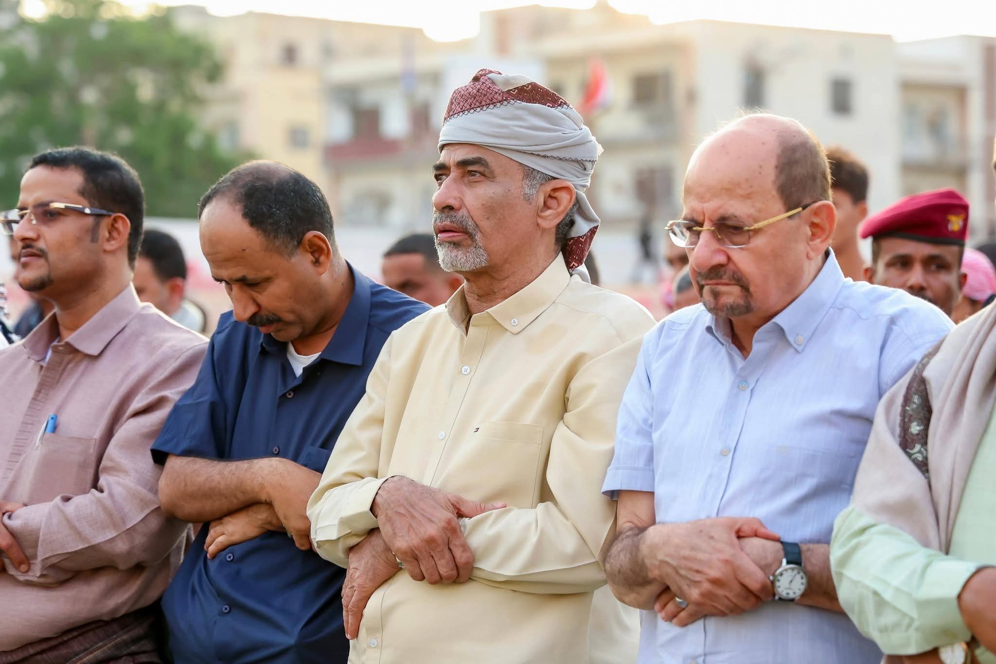 عضو مجلس القيادة الرئاسي محمود الصبيحي ورئيس الوزراء د.شايع الزنداني يؤديان صلاة عيد الفطر بعدن