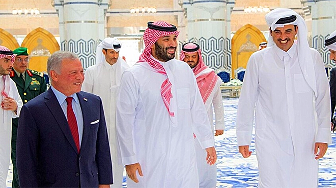 ​بحث ولي العهد السعودي الأمير محمد بن سلمان والملك الأردني عبدالله الثاني وأمير قطر الشيخ تميم بن حمد آل ثاني في جدة، مستجدات الأوضاع الإقليمية وتداعيات التصعيد العسكري في المنطقة.