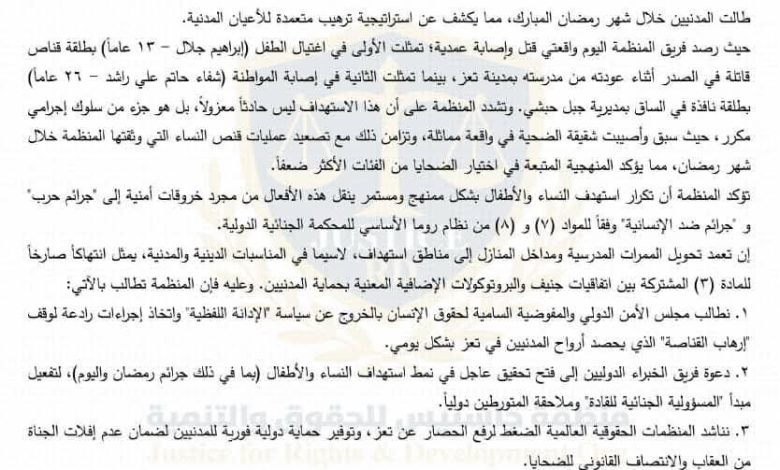 داعياً المجتمع الدولي، وفي مقدمته مجلس الأمن والمفوضية السامية لحقوق الإنسان، إلى اتخاذ إجراءات عاجلة وفعالة، تشمل فتح تحقيق دولي مستقل ومحاسبة المتورطين، إضافة إلى توفير حماية فورية للمدنيين في تعز، والعمل على رفع الحصار، بما يضمن وقف هذه الجرائم وتحقيق العدالة للضحايا.
