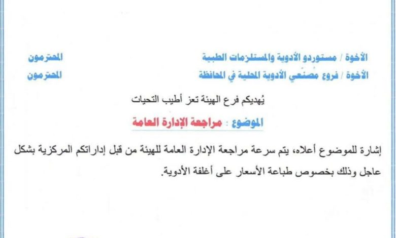 وأوضح الفرع، في تعميم صادر عنه برقم (GC4-00092)، أن على إدارات الجهات المعنية مراجعة الإدارة العامة للهيئة بشكل عاجل، وذلك بشأن الإجراءات المتعلقة بطباعة الأسعار على عبوات الأدوية.