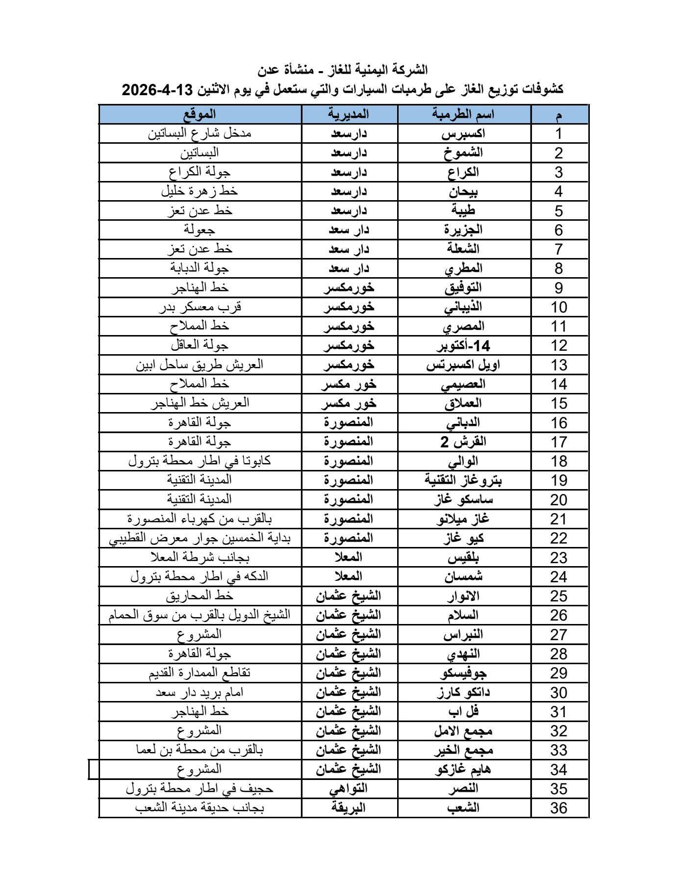 كشف توزيع الغاز على طرمبات السيارات في مديريات العاصمة عدن ليوم الاثنين الموافق 13 ابريل 2026م