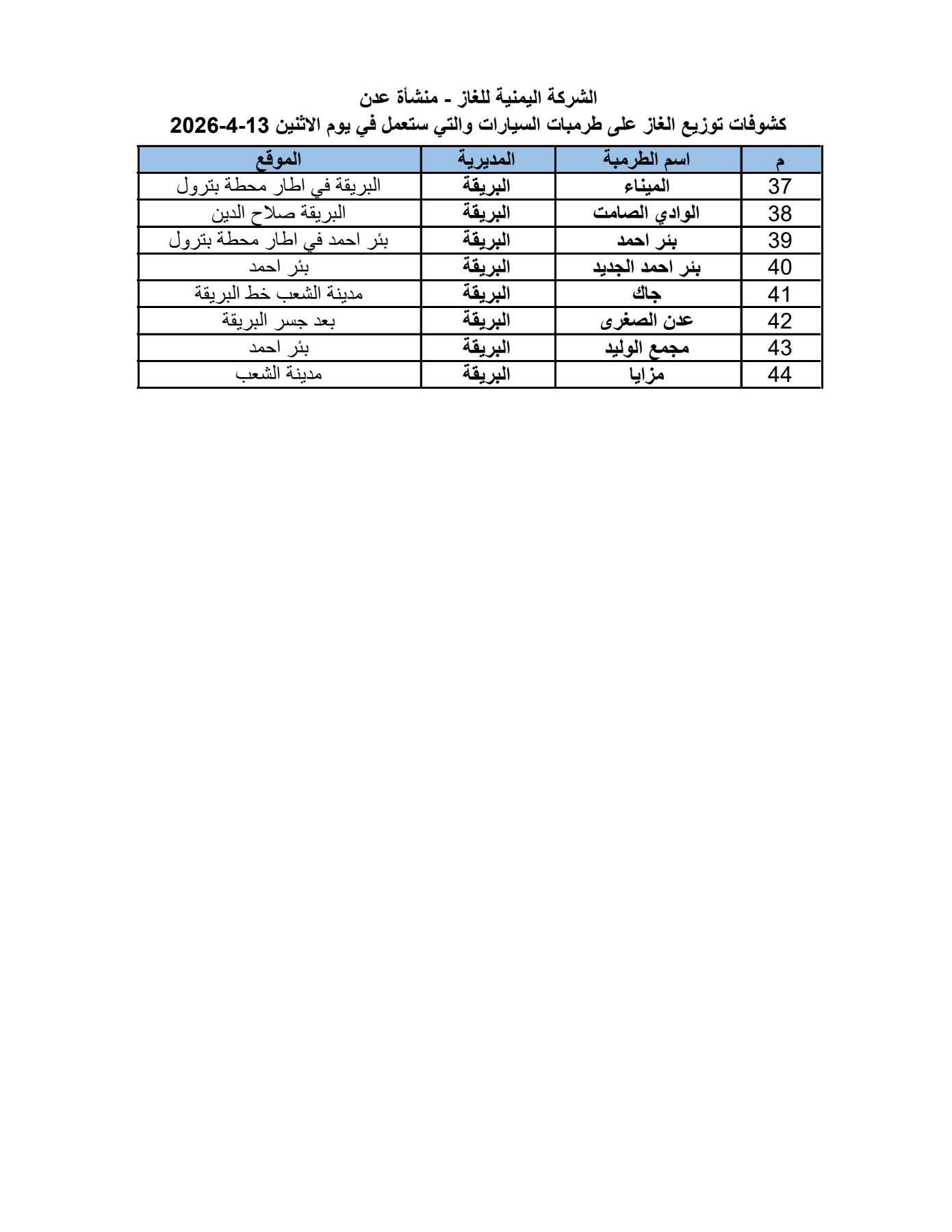كشف توزيع الغاز على طرمبات السيارات في مديريات العاصمة عدن لهذا اليوم الاثنين الموافق 13 ابريل 2026م