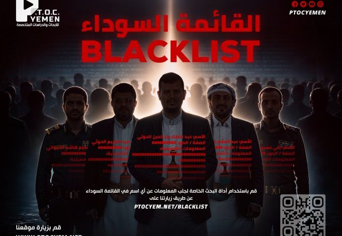 يدشن مركز P.T.O.C. Yemen للأبحاث والدراسات المتخصصة المرحلة الأولى من “القائمة السوداء” التي تضم أكثر من 2000 اسم من القيادات والعناصر المرتبطة بجماعة الحوثي، بما يشمل شخصيات سياسية وإدارية وعسكرية وأمنية.