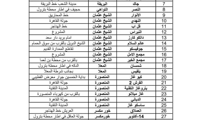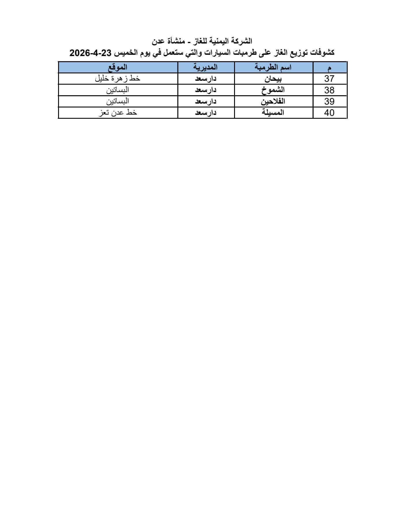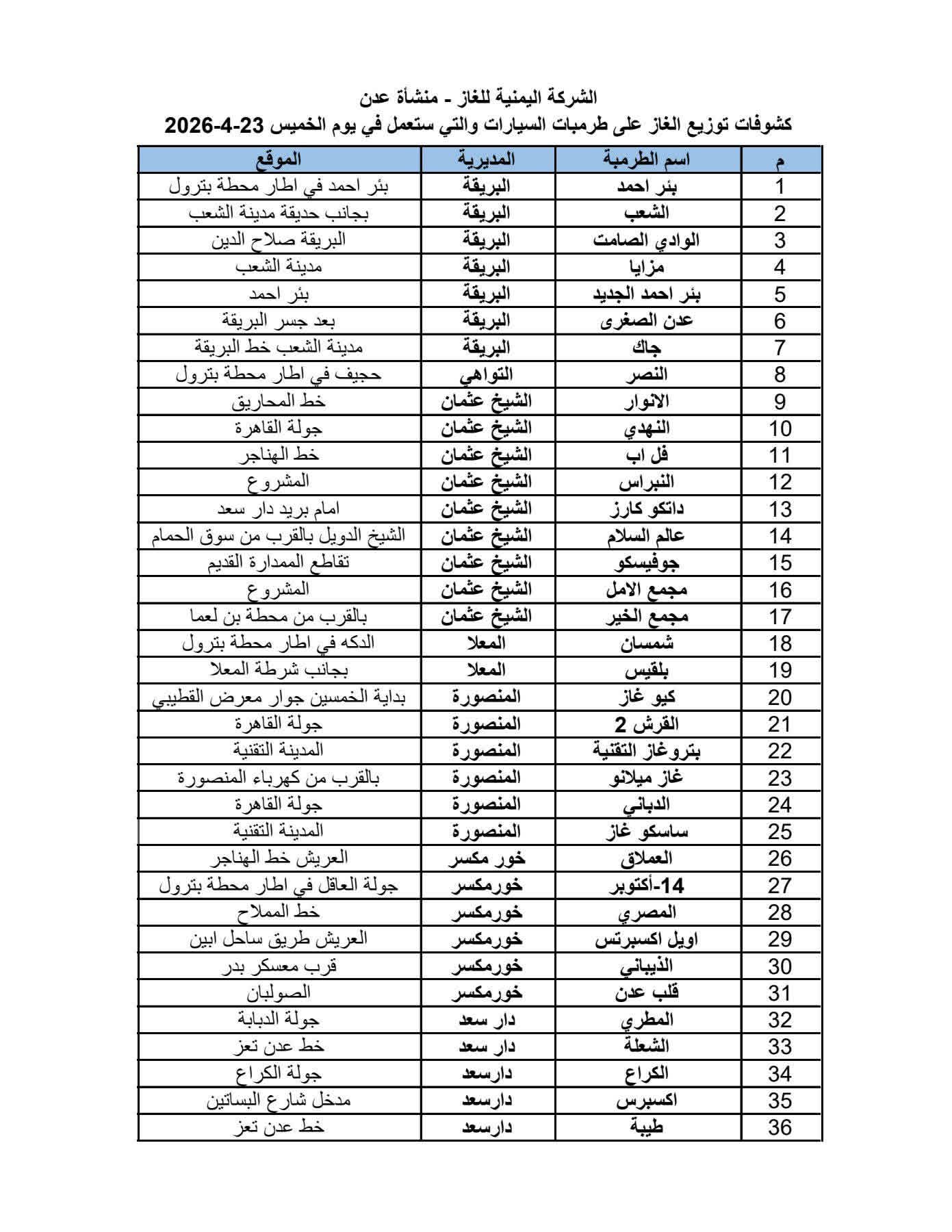 كشف توزيع الغاز على طرمبات السيارات في مديريات العاصمة عدن ليوم الخميس الموافق 23 ابريل 2026م