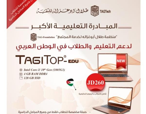 أطلقت شركة طلال أبوغزاله للتقنية، إحدى شركات “طلال أبوغزاله العالمية”، مبادرة غير ربحية بالتعاون مع منظمة طلال أبوغزاله “الخيرية” (TAG Foundation) لتمكين كل طالب عربي من الحصول على جهاز لابتوب (TAGITOP-EDU) المصنّع لغايات التعلم الرقمي، بسعر رمزي.
