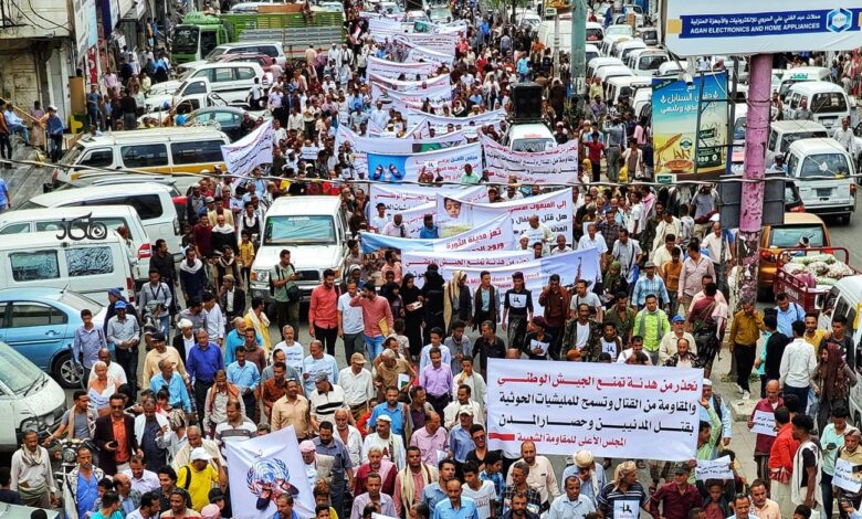 ورفع المحتجون شعارات ولافتات مؤكدة على الدور النضالي للمدينة في الحفاظ على الثوابت الوطنية واستعادة الدولة وبناء اليمن الاتحادي الجديد.
