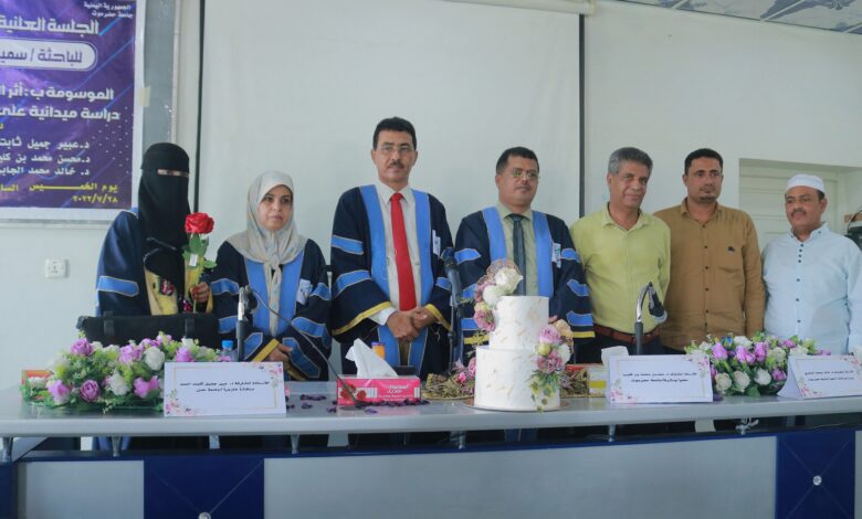جرى ذلك خلال الجلسة العلنية للمناقشة في مجمع كليات جامعة حضرموت بمدينة المكلا، بحضور اللجنة المكونة من أ.د عبير جميل ثابت – مناقشًا خارجيًا من جامعة عدن، أ.د محسن محمد بن كليب – مشرفًا ورئيسًا من جامعة حضرموت، أ.د خالد محمد الجابري – مناقشًا داخليًا من جامعة حضرموت.