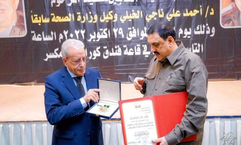كرم مدير مكتب رئاسة الجمهورية الدكتور يحيى الشعيبي، اليوم الفقيد الدكتور أحمد علي ناجي ( وكيل وزارة الصحة العامة والسكان سابقاً ) بدرع الواجب الذي منحه رئيس مجلس القيادة الرئاسي الدكتور رشاد العليمي للفقيد نظير جهوده الطيبة وعمله الدؤوب خلال فترة حياته التي أفناها في خدمة الوطن.