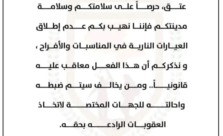 ” الى كافة المواطنين في مدينة عتق حرصاً على سلامتكم وسلامة مدينتكم فإننا نهيب بكم بعدم إطلاق الأعيرة النارية في المناسبات والافراح ونذكركم ان هذا الفعل معاقب عليه قانونياً ومن يخالف سيتم ضبطه وإحالته الى الجهات المختصة لإتخاذ العقوبات الرادعة بحقه” .