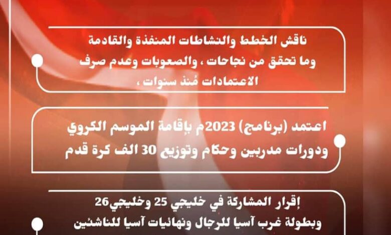 مجلس إدارة اتحاد كرة القدم يقر التحضير لاجتماع الجمعية العمومية.ويعتمد (برنامج) 2023م..واختار 5 اعلاميين لخليجي 25