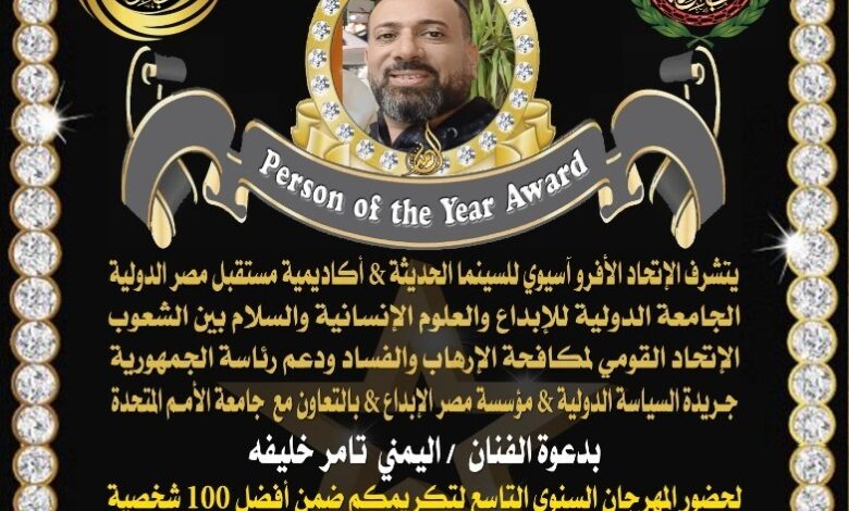 يتشرف الاتحاد الأفرو أسيوي للسينما الحديثة وأكاديمية مستقبل مصر الدولية والجامعة الدولية للإبداع والعلوم الإنسانية والسلام بين الشعوب، والاتحاد القومي لمكافحة الإرهاب، بدعوة كريمة للفنان اليمني الشباب المتميز/ تامر خليفة للمشاركة في الحفل والتكريم ضمن أفضل 100 شخصية متميزة مؤثرة في مصر والوطن العربي للعام 2022م طبقاً لمعايير البرنامج الدولي لتكريم أفضل الشخصيات المتميزة.