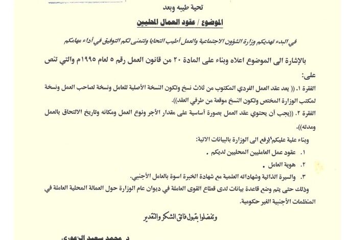 جاء ذلك في مذكرة معالي وزير الشؤون الاجتماعية والعمل الدكتور محمد سعيد الزعوري الموجهة للمديرين التنفيذيين للمنظمات الاجنبية الغير حكومية اوضح فيها انه بناء على المادة (20) من قانون العمل رقم( 5) لعام 1995م والتي نصت في فقرتيها الاولى والثانية على “ان عقد العمل الفردي المكتوب من ثلاث نسخ وتكون النسخة الاصلية مع العامل ونسخة لصاحب العمل ونسخة للمكتب الوزارة المختص وتكون النسخ موقعة من طرفي العقد ، ويجب ان يحتوي عقد العمل بصورة اساسية على مقدار الاجر ونوع العمل ومكانه وتاريخ الالتحاق بالعمل ومدته” ، فإنه يتوجب عليكم سرعة الرفع الى وزارة الشؤون الاجتماعية والعمل بالعاصمة عدن، بيانات كاملة عن عقود عمل العمال المحليين لديكم ، وهوية العامل، والسيرة الذاتية والشهادة العلمية وشهادة الخبرة أسوة بالعامل الأجنبي.