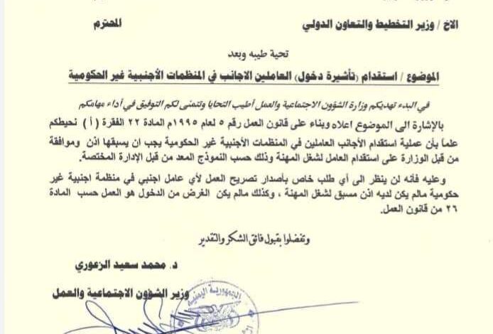 دعت وزارة الشئون الإجتماعية والعمل بالعاصمة المؤقتة عدن بضرورة إستقدام تأشيرات دخول للعاملين الأجانب في المنظمات الأجنبية غير الحكومية.