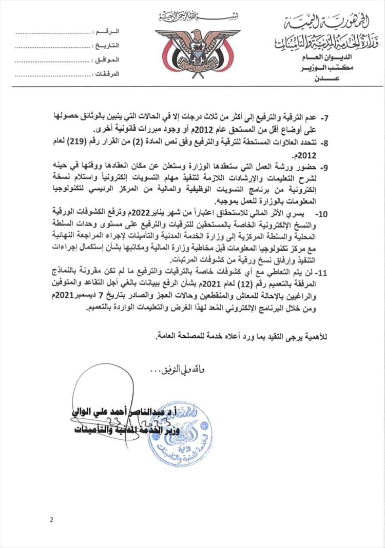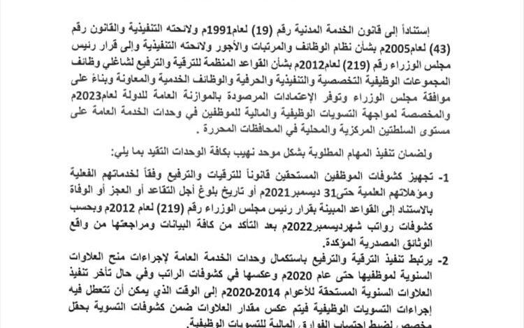 عدن اوبزيرفر-عدن تايم:أعلن وزير الخدمة المدنية والتأمينات في تعميم رقم 2 لعام 2023م عن فتح إجراءات الترقيات والترفيع لوحدات الخدمة المدنية على مستوى السلطتين المركزية والمحلية في المحافظات المحررة.