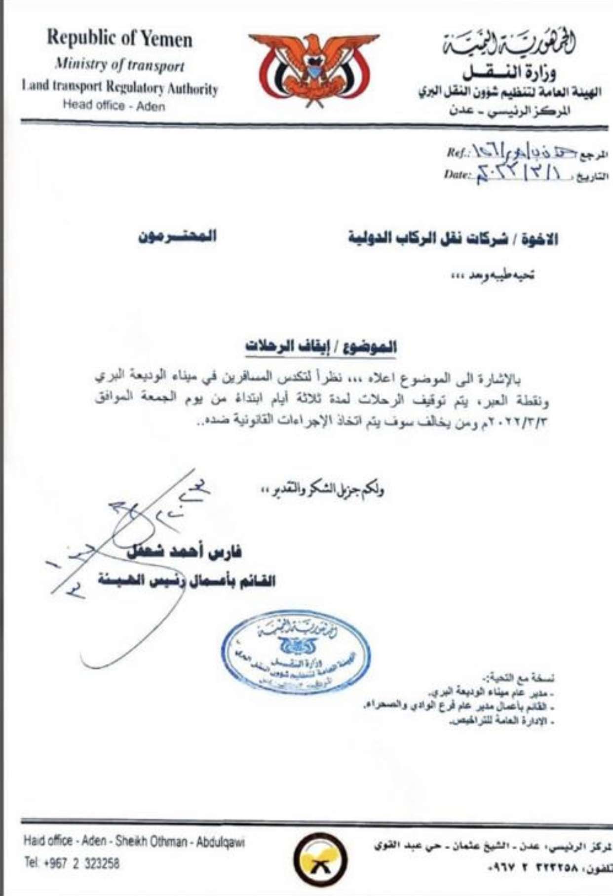 وقالت الهيئة خلال تعميم لشركات نقل الركاب الدولية انه نظرًا لتكدس المسافرين في منفذ الوديعة البري ونقطة العبر يتم ايقاف الرحلات لمدة ثلاثة ايام إبتداءً من الجمعة القادمة.