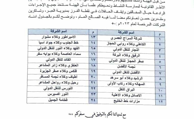 هيئة النقل البري تحدد اسماء الشركات المعتمدة لنقل الركاب والمرخصة للعام ٢٠٢٣م (وثيقة)