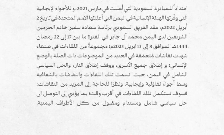 امتداداً للمبادرة السعودية التي أعلنت في مارس 2021، و للأجواء الإيجابية التي وفّرتها الهدنة الإنسانية في اليمن التي أعلنتها الامم المتحدة في تاريخ 2 أبريل 2022م، عقد الفريق السعودي برئاسة سعادة سفير خادم الحرمين الشريفين لدى اليمن محمد آل جابر في الفترة ما بين 17 إلى 22 رمضان 1444هـ الموافق 8 إلى 15 أبريل 2025م ؛ مجموعةً من اللقاءات في صنعاء شهدت نقاشات متعمقة في العديد من الموضوعات ذات الصلة بالوضع الإنساني؛ وإطلاق جميع الأسرى، ووقف إطلاق النار، والحل السياسي الشامل في اليمن حيث اتسمت تلك اللقاءات والنقاشات بالشفافية وسط أجواء تفاؤلية وإيجابية. ونظرًا للحاجة إلى المزيد من النقاشات فسوف تستكمل تلك اللقاءات في أقرب وقت؛ بما يؤدي إلى التوصل الى حل سياسي شامل ومستدام ومقبول من كل الأطراف اليمنية.