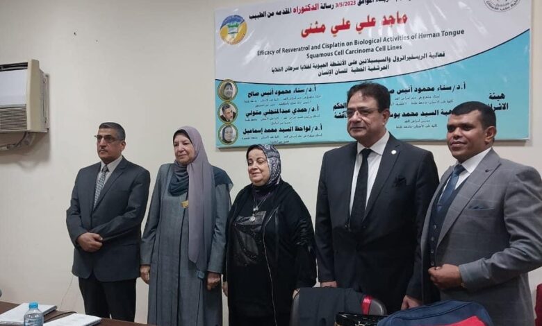 منحت كلية طب الأسنان بجامعة طنطا بجمهورية مصر العربية درجة الدكتوراه في أمراض الفم والوجه والفكين والتوصية بتبادلها مع الجامعات والمراكز البحثية للباحث الطبيب/ماجد علي علي مثنى، في المناقشة العلنية التي تمت صباح اليوم الأربعاء (3 مايو 2023م) عن أطروحته الموسومة بـ “فعالية الريسفيراترول والسيسبلاتين على الأنشطة الحيوية لخلايا سرطان الخلايا الحرشفية الخطية للسان الانسان”.