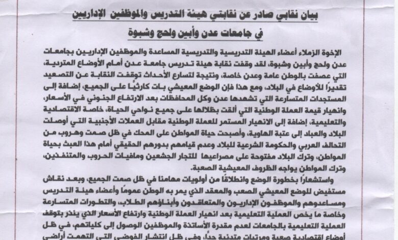 لوجت اربع جامعات حكومية هي جامعة عدن ولحج وابين وشبوة بالاضراب الكامل والمفتوح عن العمل اذا لم يتم الموافقة على جميع مطالبها المحدة في البيان التالي: