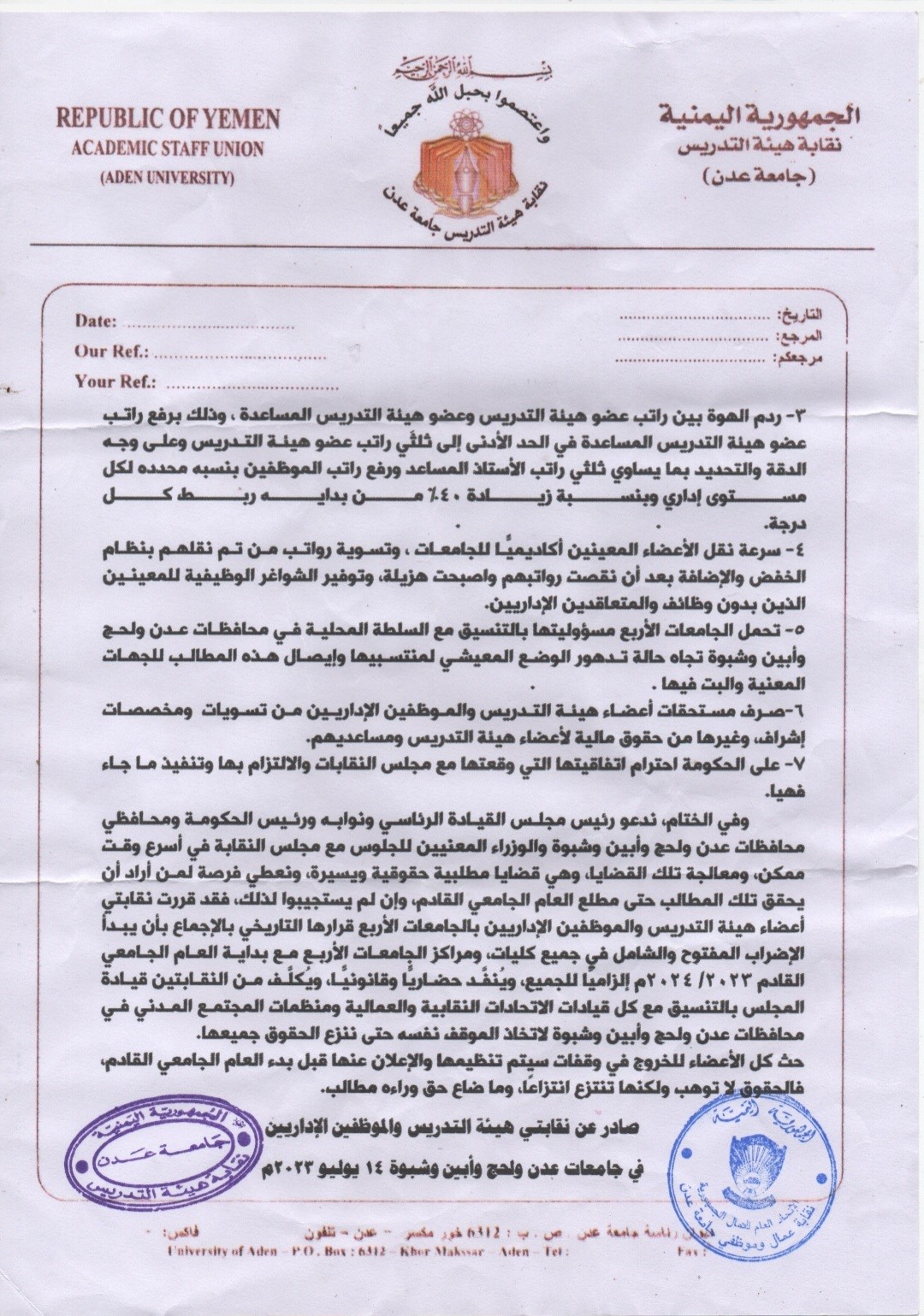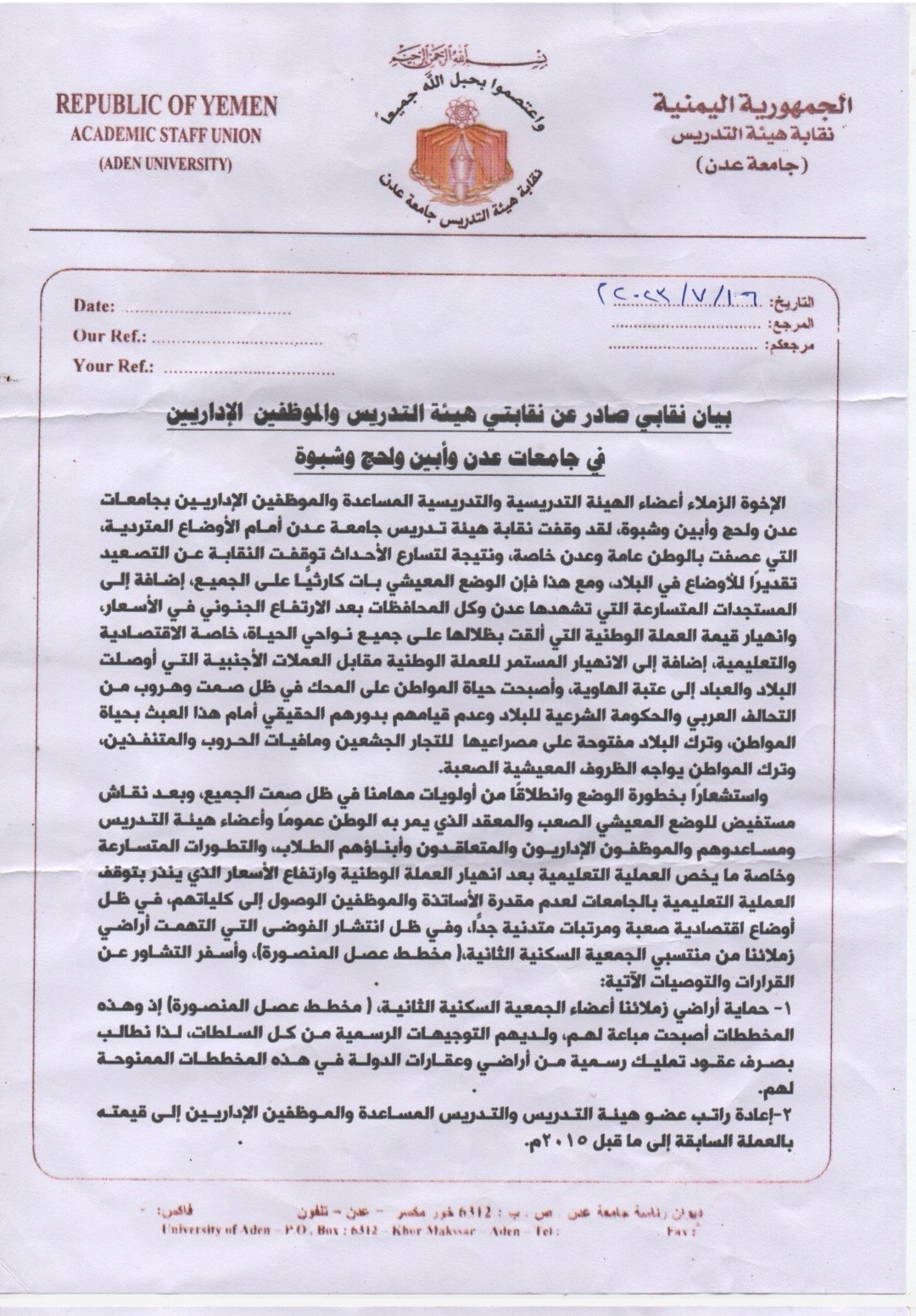 لوجت اربع جامعات حكومية هي جامعة عدن ولحج وابين وشبوة بالاضراب الكامل والمفتوح عن العمل اذا لم يتم الموافقة على جميع مطالبها المحدة في البيان التالي: