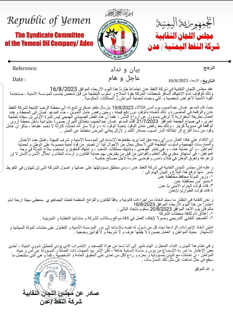 عقد مجلس اللجان النقابية في شركة النفط عدن إجتماعاً طارئاً هذا اليوم الأربعاء الموافق 16/8/2023
