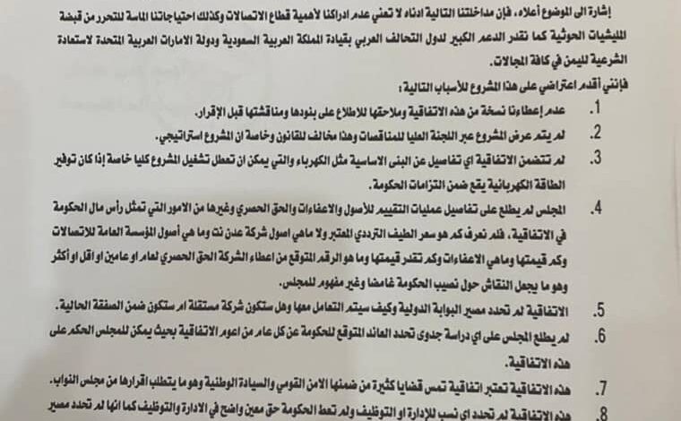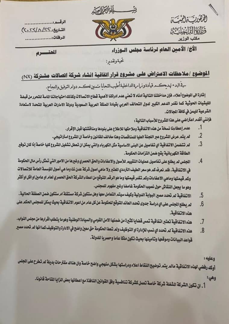 واكدت وثيقة ارسلها وزير الداخلية ان الوزير كعضو بالحكومة يرفض تحرير الاتصالات من ارتباطها بمليشيا الحوثي وذلك من خلال رفضه لانشاء شركة اتصالات جديدة كانت قد وقعت الحكومة على انشاءها.