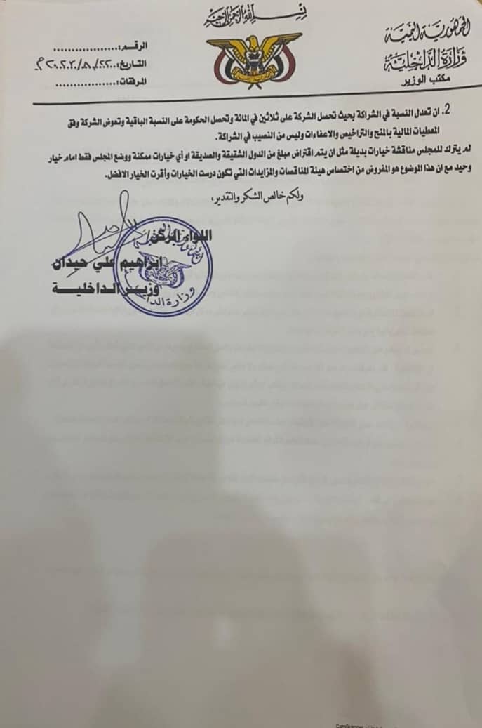 وأظهرت رسالة وزير الداخلية ابراهيم حيدان تدخله بشكل سافر في مهام رئاسة الوزراء التي وقعت الاتفاقية قبل ايام، كما يؤكد ان وزير الداخلية يحاول الى جانب بعض المنتمين لتنظيم حزب الاصلاح الاخواني اعاقة الاتفاقية وانشاء الشركة.