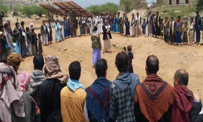 القيادي الحوثي مهدي المشاط خلال تجمع لأتباع الميليشيات في محافظة عمران (إعلام حوثي)