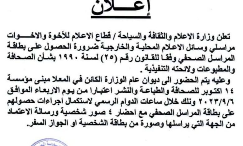 ودعت وزارة الإعلام الراغبين في الحصول على بطاقة صحيفة بالحضور إلى ديوان عام الوزارة الكائن في مبنى مؤسسة 14 أكتوبر للصحافة والنشر بالمعلا، وذلك اعتباراً من يوم الأربعاء الموافق 2023/9/6م، خلال ساعات الدوام الرسمي.