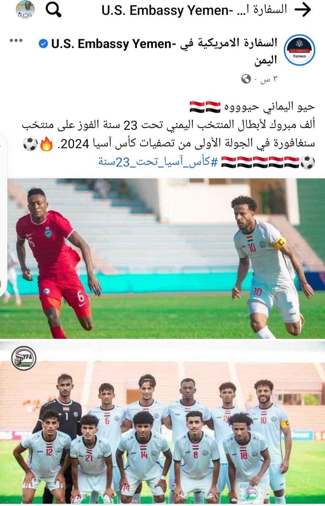 اثار نشر موقع السفارة الأمريكية في اليمن على صفحته بالفيس بوك تهنئة للمنتخب اليمني بمناسبة فوزه على منتهب سنغافورة اليوم 3\0استغراب المتابعين حيث نشرت السفارة ولأول مرة في تاريخها مايلي: