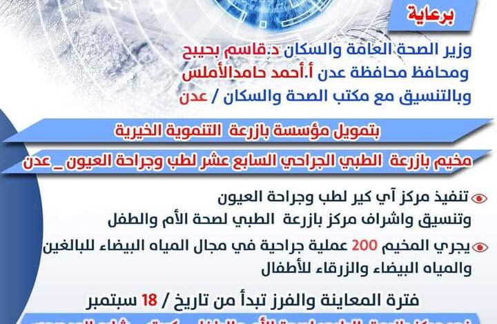 حيث تبدأ فترة المعاينة والفرز، من تاريخ 18 سبتمبر في مركز بازرعة الطبي لصحة الأم والطفل بمديرية كريتر شارع العيدروس ومن 19 حتى 21 سبتمبر في مركز آي كير لطب وجراحة العيون الواقع في جولة بدر بمديرية خور مكسر مقابل مسجد آل البيت.